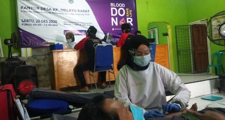 Sambut hari relawan Palang Merah Indonesia (PMI), Kepala Desa Kampung Melayu Barat, Kecamatan Teluknaga, Kabupaten Tangerang Subur Maryono ajak warganya untuk donor darah, Sabtu (26/12/2020).